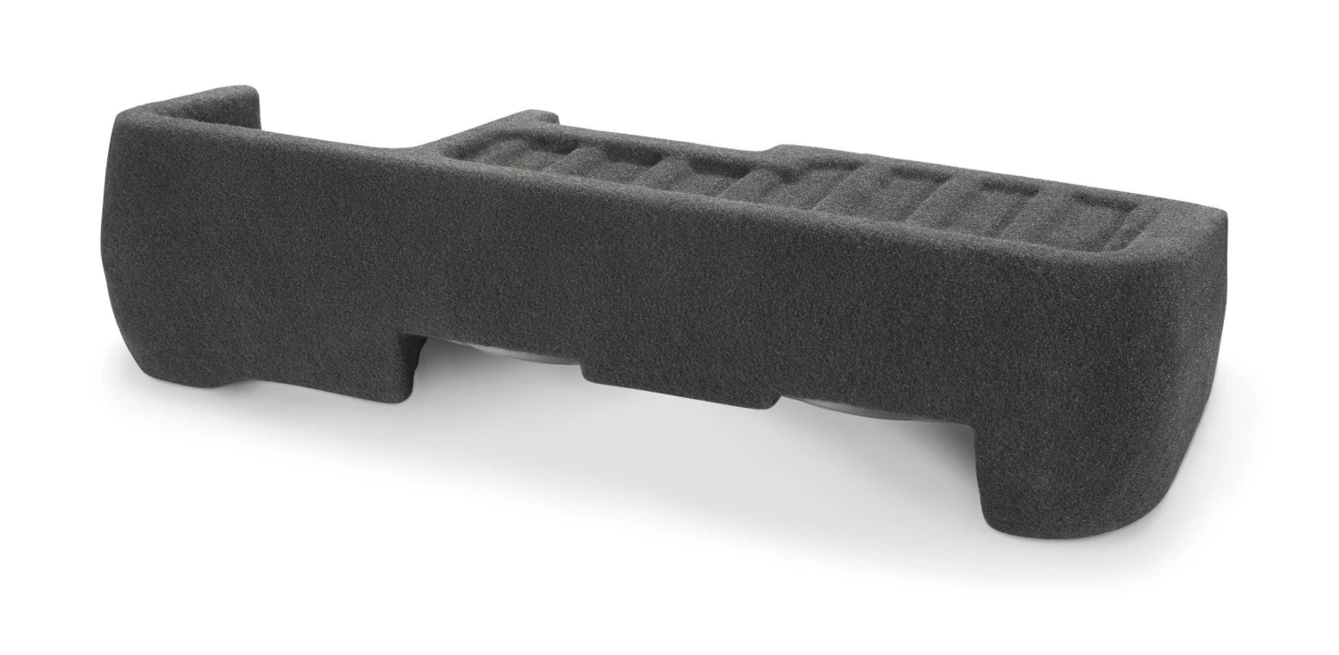 Our Stealthbox® for the Double Cab version features an all-fiberglass, sealed enclosure design that mounts under the rear seat and requires no holes to be drilled for installation. Outfitted with a pair of our revolutionary 10TW3 thin-line subwoofers, this Stealthbox® fills your truck with stunning amounts of JL Audio bass, with no intrusion on cab space. We even left a recess on the Stealthbox’s top for amplifier installation, if desired.